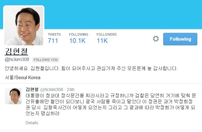 김 교수는 14일 트위터에 올린 글에서 "대통령이 청와대 정식 문건을 '찌라시'라고 규정하니까, 검찰은 당연히 거기에 맞춰 문건유출에만 혈안이 되다 보니 결국 사람을 죽이고 말았다"고 주장했다.