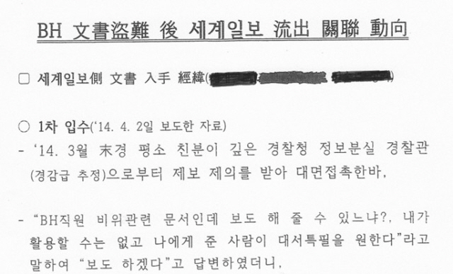 문건에는 <세계> 기자에게 2차에 걸쳐 청와대 문서를 건넨 경찰 정보관이 문서의 출처에 대해 "MB정부 마지막 시기 BH 민정(수석실)에 근무하다 2013년 초 정권이 바뀌면서 대검찰청 범죄정보과(범정)로 복귀했고 지금도 범정에 근무 중인 친한 사람"을 지목하는 내용이 있다. 이 정보관은 위의 '친한 사람'이 문서를 입수한 원출처에 대해서는 "MB정부 말 민정에 근무 중인 경찰관으로부터 받았으니 신빙성은 의심할 여지가 없다"고 했다고 한다.