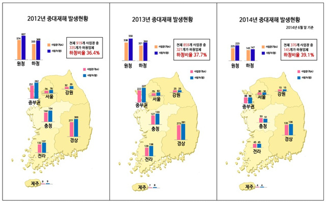 전체 산업으로 확장해도 2012년 919건이던 중대재해 건수는 지난해 859건으로 줄었고, 올해도 예년에 견줘 감소할 전망이다.(2014년 6월 기준 370건) 통계로만 따지면 죽거나 다치는 노동자 수는 해마다 조금씩 줄고 있다는 얘기다. 물론 이 가운데 하청업체 노동자가 차지하는 비중은 갈수록 늘어난다.