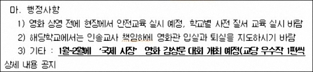 또 공문에는 학교별 배정인원은 학생 45명과 교사, 교직원이라고 명시돼 있고 관람일시와 상영시간, 학교별 좌석 배정 결과도 나타나 있다. 뿐만 아니라 1~2월 중 중학생 대상 '국제시장' 영화 감상문 대회를 개최한다는 내용도 포함돼 있다. 이어 교직원들에게 '적극 홍보'를 당부하는 문구도 적혀 있다.