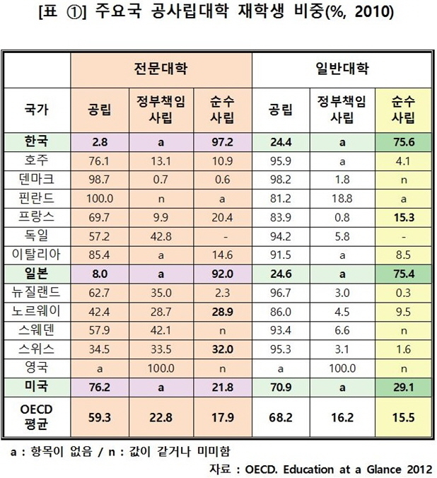 [표 ➀]에서 보는 바와 같이, 한국의 국공립 대학은 24.4%, 일본은 24.6% 등에 불과한 반면, 대부분의 유럽 국가들은 국공립의 비중이 80∼90% 이상을 차지하고 있다(이 같은 사정은 한국이 경제성장을 하는 과정에서 국민교육의 여력이 없었기 때문에 교육을 주로 사립에 의존한 결과이다. 이것은 이미 60여년 이상 지속되어온 것이기 때문에 당장 정부의 교육 투자로 해소할 수 없다. 따라서 흔히 교육 문외한 들이 지적하는 것처럼 무리하게 정부의 교육 투자를 OECD 선진국 수준으로 바로 확대하자는 것은 바람직하지 않다. 그것은 국립대학교 수를 그 만큼 늘린 다음에나 가능한 말인데 한국의 현실에서는 불가능하다). 대부분의 선진국들은 고등교육을 국가가 전담하다시피하고 있다. 이런 관점에서만 보면, 한국의 대학 등록금은 세계 최고수준이라고 할 수 있다. 그 만큼 상대적으로 한국 대학생들의 경제적 부담이 크다는 말이다.