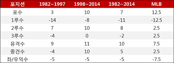 '한국형 포지션별 조정 점수'와 메이저리그의 포지션별 조정 점수의 차이는 포수와 유격수, 2루수 부분에서 두드러진다. 메이저리그는 포수 대체선수가 가장 낮은 타격성적을 기록했지만, KBO리그의 경우 유격수와 2루수가 더 낮았다.