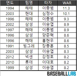 KBO리그 역사상 한 시즌에 혼자 힘으로 10승 이상을 팀에 가져다준 야수는 딱 두 명뿐이다. 1994년 해태 이종범(WAR 11.3)과 2003년 현대 심정수(WAR 10.1)다. 특히 이종범은 1994년 외에도 1996년(WAR 9.3), 1997년(WAR 8.9)까지 KBO리그 단일시즌 타자 WAR 1, 3, 4위를 독식하고 있으며, 심지어는 방위병 근무 때문에 63경기만 출전한 1995년에도 WAR 4.9를 올리는 거짓말 같은 활약을 펼쳤다. KBO리그 역사상 1번이라도 타석에 나온 1628명 중, 선수생활 내내 WAR 4.9 이상을 기록한 선수는 단 239명뿐이다. 다시 말해 데뷔해서 은퇴할 때까지 팀에 가져다준 승수가 1995년 이종범이 방위병으로 복무하면서 홈 63경기에만 출전해서 올려준 승수보다도 적었던 선수가 1389명이나 된다는 이야기다.