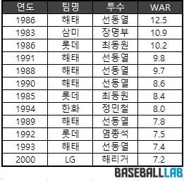 단일 시즌 최고 투수: 1986년 해태 선동열 (WAR 12.5)
