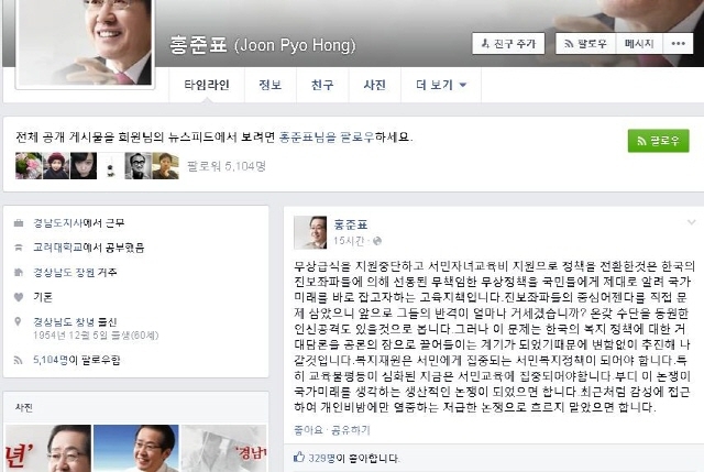 홍준표 경남도지사가 자신의 페이스북을 활용한 '고독한' 선별 복지 여론전을 이어가고 있다.