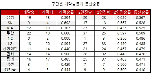 KIA의 경우 개막전은 12승 19패로 부진했지만, 2차전에서는 15승 16패로 1차전 패배를 만회하는 경우가 적지 않았습니다. 통산 승률 1위팀인 삼성의 경우 개막 1차전 승리는 두산보다 적었지만, 2차전에서는 20승 10패로 압도적인 전적을 기록했습니다. 반면 통산 승률 하위인 한화는 개막전은 5할 승률이었지만, 2차전에서는 12승 18패로 첫 날의 기세를 이어가지 못했습니다. 롯데 역시 개막전은 5할에 가까운 승률을 올렸지만(0.485), 2차전에서 9승 20패로 전날 승리를 까먹었습니다. 전력이 강한 팀일수록 연패를 당할 확률이 적고, 약한 팀은 연승을 좀처럼 올리지 못한다는 점을 생각하면 당연한 결과입니다.