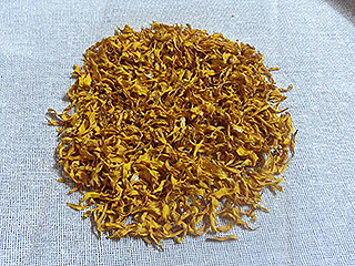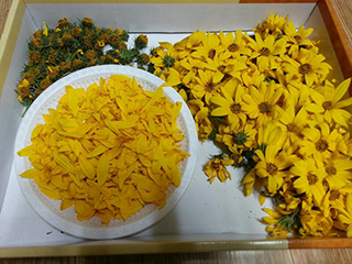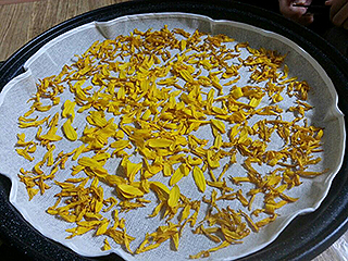 1. 꽃을 따서 가장자리 노란색 꽃잎만 살며시 따서 옥당지나 천을 깐 채반에 담는다.(꽃을 통으로 덖을 때는 꽃대를 바짝 잘라 통으로 손질해두었다가 차를 덖기 전에 채반에 널어 살짝 수분을 날리는 시들림을 한다.)