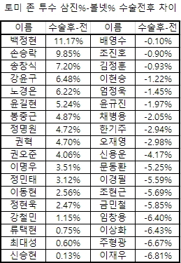 이는 KBO리그도 마찬가지. 조사 대상으로 삼은 토미 존 수술 투수 41명의 수술 전후 성적 변화를 정리한 다음 표를 살펴보자.