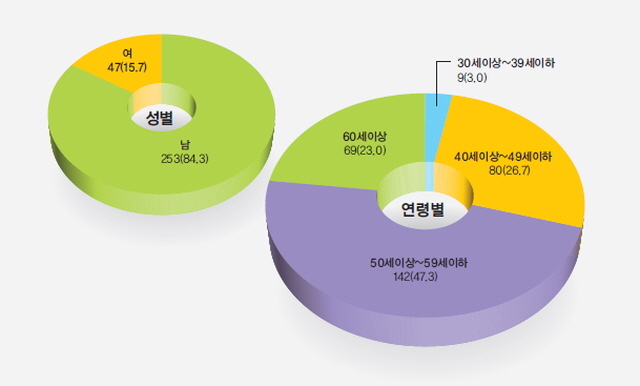 연령별 구성도 유권자 분포와 당선자 분포간 차이가 크긴 마찬가지입니다. 19세를 포함한 20대 유권자 비율은 18.4%이지만 당선자가 한명도 없고, 유권자의 20.5%를 차지하는 30대 역시 당선자는 고작 9명(3%) 뿐입니다. 반면, 50대 당선자는 절반에 육박하는 142명(47.3%)으로 유권자 비율(18.9%)의 2.5배에 달합니다.