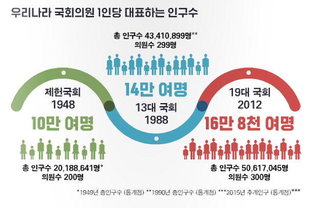1948년 제헌국회 당시 국회의원은 200명이었습니다. 이후 1987년 민주화로 탄생한 13대 국회는 299명, 현재 19대 국회는 300명입니다. 제헌국회와 비교해 총 인구수가 2.5배 늘어나는 동안 국회의원수는 1.5배 증가에 그쳤습니다. 제헌국회는 국회의원 1명이 국민 10만 명을 대표했다면, 지금은 16만8천 명을 대표해, 인구수를 기준으로 한 대표성은 크게 낮아졌다고 볼 수 있습니다. 시대 변화에 따라 국민들의 다양한 요구와 다원화된 가치를 반영하려면 의원정수 확대를 고려해야 합니다.