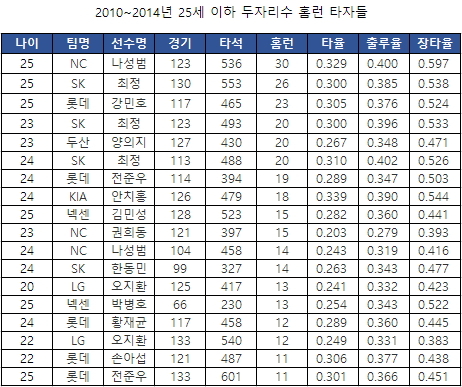 2010~2014년까지 25세 이하 타자의 두 자리 수 홈런 시즌은 총 18차례 나왔다. 이 중 가장 많은 홈런을 기록한 NC 나성범은 지난해 만 25세로, 대학을 졸업하고 이미 프로 입단 3년차에 접어든 상태였다. 가장 어린 나이에 두 자리 수 홈런을 쳐낸 LG 오지환은 스무 살인 2010년 13개 홈런을 쳐냈지만 그 이후로는 5년간 34개를 추가하는데 그치고 있다. 또한 입단 첫 해 23세 나이로 두 자리 수 홈런을 때려낸 NC 권희동은 다음해 홈런 7개를 추가한 뒤 올해 상무에 입대한 상태다. 스무 살 시즌인 2006년 12개 홈런을 때려내며 기대를 모은 SK 최정이 첫 10년간 때려낸 홈런 수는 167개로, 이승엽이 첫 9년간 기록한 홈런 수(324개)의 절반 수준에 불과하다.