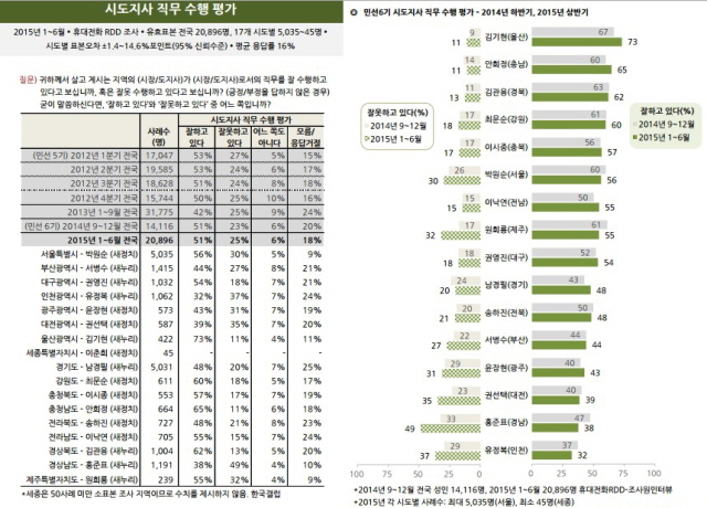 17개 단체장 평균은 '잘하고 있다' 51%, '잘못하고 있다' 25%였다. '잘하고 있다'는 긍정 평가가 평균치에 미치지 못한 단체장은 남 지사와 홍 지사, 유 시장 외에 송하진 전북지사(48%), 서병수 부산시장(44%), 윤장현 광주시장(43%), 권선택 대전시장(39%) 등이었다.