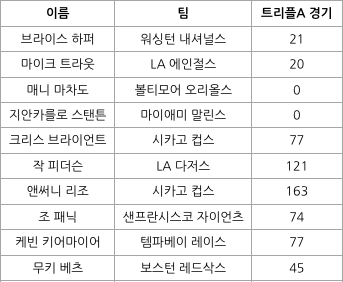 특히 이미 MVP 트로피를 소유하고 있으며 명실상부한 현 MLB 최고의 선수인 마이크 트라웃과, 한때 가장 과대평가된 선수라는 평가를 받기도 했지만 올해 마침내 꽃을 피우기 시작한 내셔널리그의 브라이스 하퍼는 향후 10년은 족히 메이저리그의 얼굴로 활약할만한 재능을 가지고 있는 선수들이다. 하퍼는 아직 만 23세가 되지도 않았는데, 하퍼 이전에 만 23세 이전에 두 번 이상의 올스타전 선발출장을 이뤄낸 선수가 바로 마이크 트라웃이다. 또 마이크 트라웃 이전에 그 위업을 달성한 선수는 약물 스캔들이 있기 전까지 메이저리그에서 가장 대단한 선수 중 하나였던 알렉스 로드리게스다.