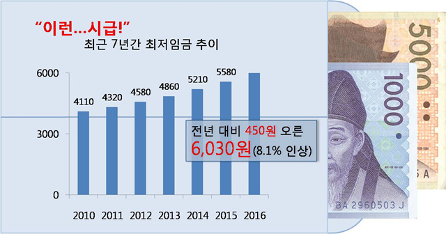 내년도 최저임금 시급이 올해보다 450원 오른 6030원으로 결정됐다. 그간 사회적 논의가 활발했던 '최저임금 1만 원'은 물론, 두 자릿수 인상률에도 못 미친 8.1% 인상이다. 450원 인상으로는 그간 정부가 강조해온 '최저임금 인상을 통한 내수 활성화' 효과 역시 기대하기 힘들다는 지적이 나온다.