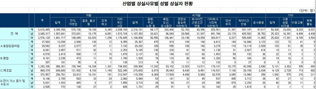 우선 고용 보험 통계 연보에 부록으로 실려 있는 고용 보험 통계표 엑셀 파일을 열어보자. 굉장히 복잡한 엑셀 표가 등장하는데, 차례 항목에서 '상실자 현황' 파트를 찾아 '산업별 상실 사유별 성별 상실자 현황' 워크시트를 찾아 들어가면 된다.