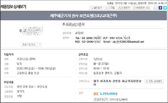 실제 M사는 구인포털 등을 통해 제주해군기지 보안인력 모집공고를 지난 8월 중순에 낸 것으로 확인됐다. 이들은 제주해군기지 군관사 정문 등에서 대한 보안, 경비 업무를 맡는다. 채용조건은 3조2교대 근무로 월급은 170만원이다.