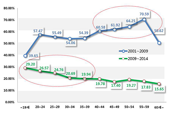 여하튼 위 그래프를 보면 2001~2009년의 경우 50~60대 상승률이 높게 나타나면서 세대별 상승률에 큰 편차를 보이고 있음을 알 수 있다. 반면 2009~2014년의 경우 젊은층 상승률이 제일 높고 장년, 중년, 노년층으로 갈수록 상승률이 떨어지는데, 그 추세가 매우 완만하게 그려지고 있음을 볼 수 있다.