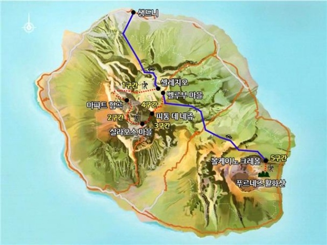 레위니옹의 지형을 보면 제주도와 같이 중앙에 피통 데 네쥬(Piton des Neiges)라는 화산이 자리잡고 있습니다. 그러나 높이가 한라산보다 1,000m 높아 3,069m나 됩니다. 이 봉우리 정점에서 뻗은 지능은 사발 모양의 분지를 만들었는데, 여기에 조용하고 감미로운 산간마을이 들어서 있습니다. 이 마을과 마을을 잇고 정상에 도달하는 3일간의 트레킹이 레위니옹 트레킹의 정수입니다.
