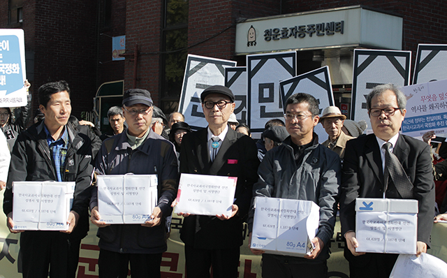 전국교직원노동조합과 민족문제연구소 등 466개 역사‧시민 단체로 구성된 '한국사교과서국정화저지네트워크'가 이날 오전 10시 서울 종로구 청운효자동주민센터 앞에서 기자회견을 열고 "한국사 교과서 국정화는 민주주의에 대한 도전"이라며 정부의 국정화 시도 철회를 촉구했다.