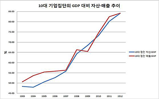 피케티의 조건에 맞추어 한국의 상황을 평가하기에는 객관적 자료가 부족하지만, 고도 성장기가 끝나고 갈수록 부의 대물림이 두드러지면서 세습 자본주의를 향해 나아가는 과정이라고 판단된다. 특히 최상층만을 보았을 때는 이미 세습 자본주의의 모습을 띠고 있다고 해도 과언이 아니다. 우리나라의 최고 부자들은 자신의 손으로 부를 일군 경우가 별로 없고 대부분 선대의 재산을 물려받은 사람들이다. <재벌닷컴>이 작년 봄에 집계한 '대한민국 상장사 100대 주식 부자' 중에서 85명이 세습 재벌 가문이었다. 게다가 우리나라 재벌들은 재산만 상속하는 것이 아니라 경영권까지 상속한다. 이들 2세, 3세 세습 경영자들이 지배하는 재벌들은 한국 경제를 압도하고 있다. [그림 3]은 10대 재벌의 자산과 매출액을 GDP(국내 총생산)에 대한 비율로 평가했을 때 2003년~2012년 사이에 50% 내외에서 84% 정도까지 급속도로 증가하였음을 보여준다.