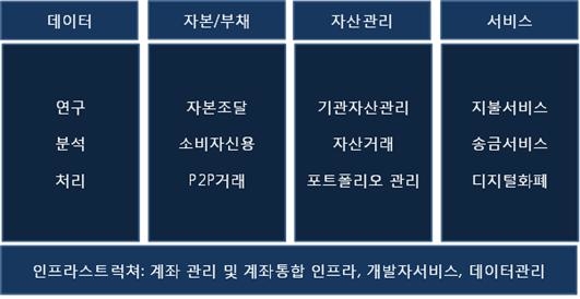 핀테크 산업은 크게 인프러스트럭쳐, 데이터 관리, 자본 및 부채 관리, 자산 관리, 그리고 금융 거래 서비스 영역으로 구분할 수 있다. 인프라스트럭쳐는 개인들이 계좌를 개별적으로 관리하거나 통합적으로 관리할 수 있는 솔루션이나 금융 서비스를 개발할 수 있도록 개발자들에게 툴을 제공하는 개발자 서비스, 그리고 데이터를 관리할 수 있는 솔루션을 제공하는 역할을 수행한다.