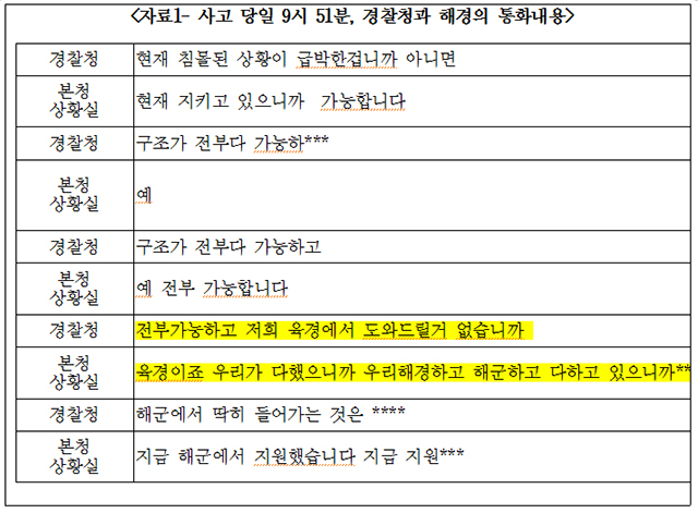 아래에서 보는 바와 같이 경찰청에서 지원 의사를 밝히지만 해경은 해경과 해군이 모두 구조 가능하다며 이를 거절한다.