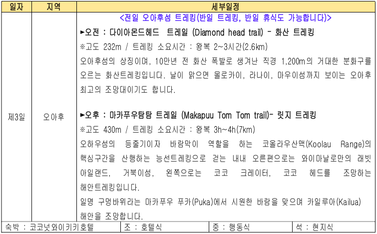 [하와이 트레킹 여행 세부 일정-6일코스]