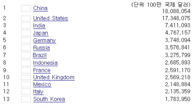 한국에서 1980년대 내내 이뤄졌던 전두환 정권에 대한 저항, 그리고 그 결과인 1987년 6월 항쟁 역시 그 흐름 위에서 다시 읽어야 한다. '긴 유럽내전의 세계체제'가 자신을 연장하기 위해 일으켰던 습곡운동은 일단 소련-동구권 붕괴라는 스펙터클로, 그 결과 생성된 미국 일극주의로 '성공리에' 마무리되는 것처럼 보였다. 그러나 그것은 채 10년이 못가는, 막간 소극이었고, 큰 그림 속의 액자와 같은 것이었다. 동구권 붕괴 후의 실제 전체 세계상황은 오히려 일극주의의 반대물인 다극주의가 거대하게 떠오르고 있는 것이었다. 9·11이 터졌을 때, 이라크 전쟁에서 미국과 유럽 사이에 균열이 생겼을 때, 이는 이미 분명해졌다. 당시 중국이 과거와 다른 모습으로 부상하고 있었고, 곧이어 남미가 떠올랐다. 신자유주의의 시작을 상징하는 것이 영국에서 마거릿 대처와 미국에서 로널드 레이건의 집권이었다면, 그 석양을 상징하는 것은 2008년 미국금융 위기였다. 이어 2010년 중국이 세계 GDP 2위, 인도가 4위로 부상했고, 2011년에는 브라질이 7위로 떠올랐다. 국가별 실제 경제상황은 GDP를 실질구매력으로 환산한 PPP (purchasing power parity)가 더 유용한데, 이 GDP-PPP기준으로 2014년 IMF 통계를 보면, 아래와 같다. 10년 전, 20년 전, 30년 전과 비교해 보라. 상전벽해의 변화는 이렇게 진행 중이다.