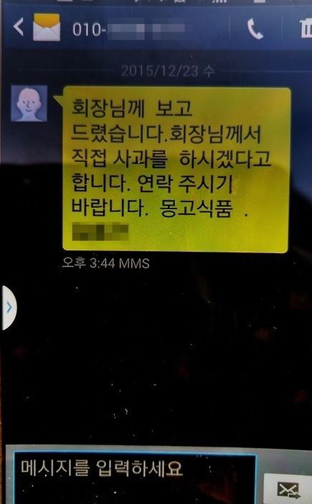 하지만 이런 사과는 공감을 얻지 못하는 분위기다. 우선 김 회장이 피해자에게 직접 찾아가서 사과하는 게 아니다. 피해자 K씨는 최근 몽고식품 관계자에게 받은 휴대전화 메시지를 공개했다. K씨가 먼저 연락하라는 내용이다.