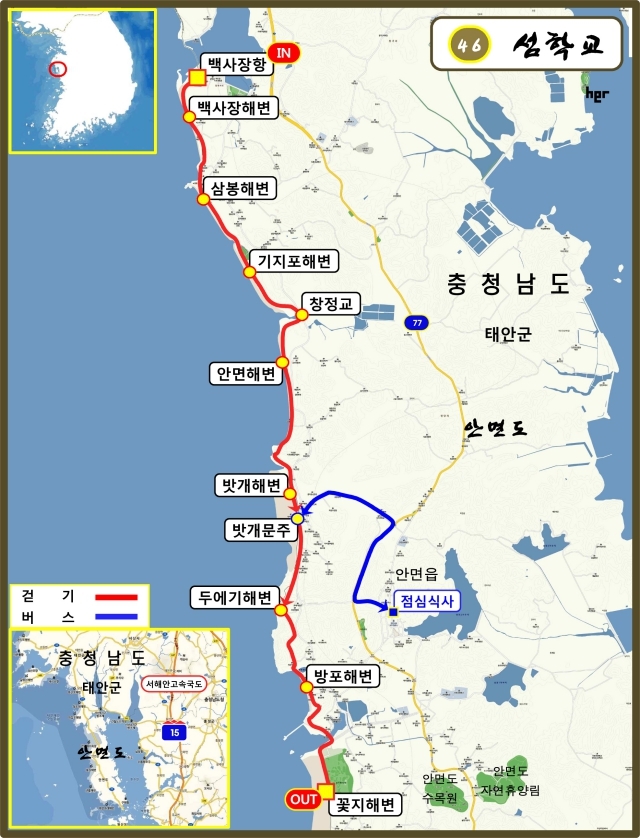 백사장항-백사장해변-삼봉해변-기지포해변-창정교-안면해변-밧개해변-밧개문주