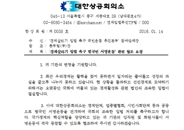 공문에 따르면 대한상공회의소는 지난 14일 서명 대상을 특정하고, 서명 인원을 매일 취합하여 송부토록 하는 공문을 발송했다. 관련 현수막을 제작해 부착하라는 등의 실무적인 홍보 내용 및 활용 방안까지 자세히 안내했다. 이 공문은 전국경제인연합회, 중소기업중앙회, 한국무역협회, 한국경영자총협회 등 서명운동에 참여하는 32개 경제 단체장에 발송됐다.
