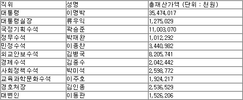 이 밖에 이동관 대변인은 15억2600만 원, 이주호 교육과학문화수석이 19억2400만 원의 재산을 신고했다. 청와대 수석 가운데 재산이 가장 적은 경우는 10억1200만 원을 신고한 박재완 정무수석이었다.