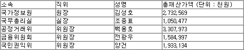 김인종 경호처장과 김중수 경제수석은 각각 25억3600만 원, 20억4000만 원의 재산액을 신고해 그 뒤를 이었다.