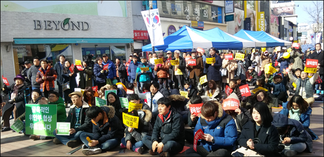 (사)정신대할머니와함께하는시민모임, 대구평화나비, 민족문제연구소대구지부 등 22개 대구지역 시민단체가 참여하는 '한일 일본군 위안부 합의 무효 대구행동'은 97주년을 맞는 3월 1일 오후 대구백화점 앞에서 '누구 맘대로'를 주제로 '한일 일본군 위안부 합의 무효를 위한 대구시민대회'를 열었다. 이날 행사에는 시민 2백여명이 참석했으며 오후 1시부터 3시까지 2시간가량 진행됐다.