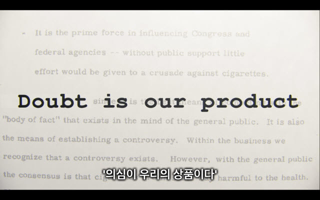 정치, 언론, 재벌권력의 강력한 카르텔을 다룬 영화 <내부자들>(우민호 감독. 2015)의 한 등장인물인 이강희 논설주필은 언론이 다루려는 대상이 누구인가에 따라 "어떠어떠하다고 보기 힘들다"라든가, "어떠어떠한 것으로 매우 보여진다" 따위로 프레임을 잡는다고 했다. 다시 말해, 같은 사실이지만 언론과 같이 신빙성 있는 누군가가 발화하는 뉘앙스가 어떠한가에 따라서 대중들이 받아들이는 것은 천지차이가 될 수 있다는 것이다. 담배의 유해성과 지구 온난화 위험에 대해서도 그 내부자들은 "완전히 알기 힘들다", "그럴 수도 있고 아닐 수도 있다", "여전히 논쟁 중이다"와 같이 모호한 말을 언론에 흘림으로써 진상을 숨기려는 그들의 목적을 관철시켜왔다. 요컨대 <의혹을 파는 사람들>이 주장하는 것은 우리가 상식처럼 알고 있는 것들이 과학적 사실을 토대로 구축되는 것이 아니라, 오히려 과학적 사실의 탈을 쓴 정치적 프로파간다일 수 있다는 점이다. 그런 정치적 의혹들은 내부자들이 파는 상품이고, 그것을 소비하는 대중들의 눈을 흐린다. 그리고 우리 건강에 영향을 미치는 하나의 결정적 요소로 자리 잡는다.