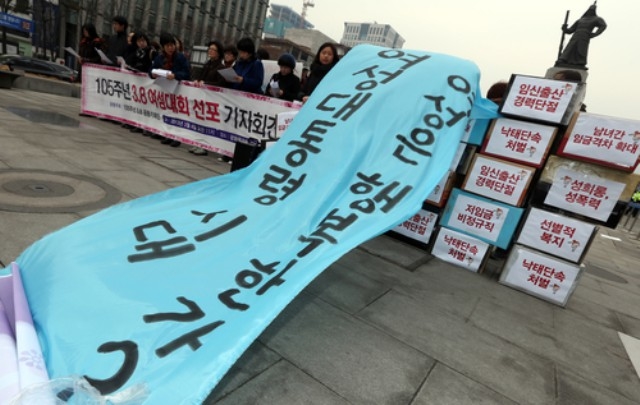 ▲ 민주노총 여성위원회를 비롯한 여성단체들은 박근혜 정권 2년째인 2013년 서울 광화문 광장에서 '3.8 여성대회 선포 기자회견'을 열고, '여성대통령 시대, 여성은 행복한가?'라고 물었다. ⓒ연합뉴스