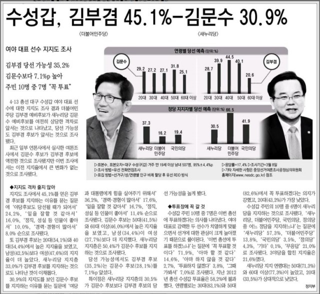 매일신문은 10일자 신문 1면과 5면(정치)에 각각 <김부겸 지지도, 김문수에 14.2%P 앞서>, <수성갑, 김부겸 45.1%-김문수 30.9%> 제목으로 '수성갑' 여론조사 결과를 보도했다.