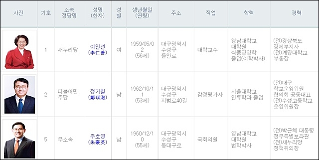 이인선 후보는 1959년 출생으로 달성초, 경북여중·고, 영남대 식품영양학과를 졸업후 동 대학 대학원에서 석·박사를 졸업했다. 경북대의대 면역학교실 연구원, 전 계명대 부총장, 전 경상북도 정무부지사, 전 대구경북과학기술원(DIGIST) 원장을 지냈고, 현재 계명대 식품가공학과 교수를 맡고 있다.