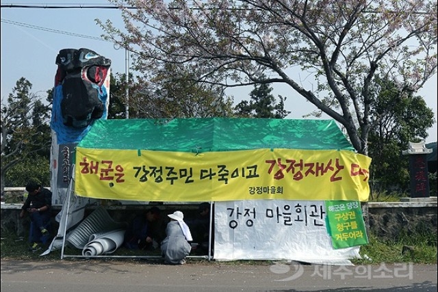 11일 오전 10시. 제주해군기지가 들어선 서귀포시 강정마을 주민 4명이 '강정마을회관'이라고 적힌 3평 남짓 임시 천막에 앉아있었다. 그 위로는 벚꽃이 흩날리고 있었다.