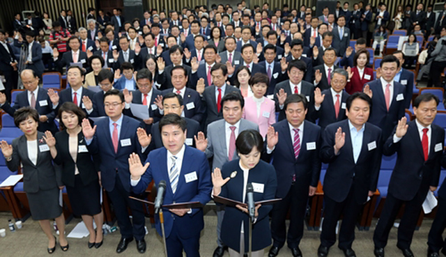 워크숍 '피날레'로 새누리당 20대 당선인들이 발표한 결의문 형태의 '반성문'에는 "계파와 정파에 매몰된 작은 정치를 극복하고, 민심을 존중하는 '민심 정치'를 펼쳐나가겠습니다"는 내용이 담겼다.