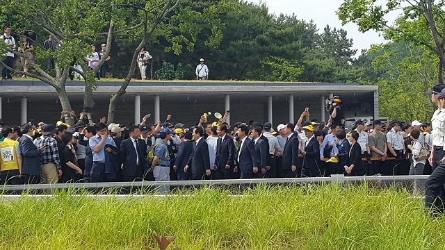 ▲ 23일 故 노무현 전 대통령 서거 7주기 추도식에 참석한 정계 인사들이 묘역 참배를 마치고 이동하고 있다. ⓒ최상인 기자