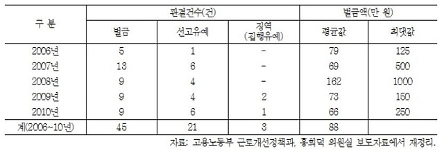 최저임금 사각지대를 없애려면?법정 최저임금 미달자가 많은 데 대해 정부와 재계는 "최저임금이 비현실적으로 높아서"라고 답하곤 했다. 하지만 이는 각종 여론조사에서 최저임금이 너무 낮다고 답하는 대다수 국민의 인식과 배치된다. 고용주로서는 "법을 안 지켜도 손해 볼 게 없고 문제될 게 없으니 일단 안 지키고 보는 거다"가 솔직한 답변일 게다. 실제로 2006년부터 2010년까지 최저임금법 위반 사건 판결 내용을 보면 벌금형이 45건이고, 징역형은 선고유예 21건, 집행유예 3건뿐이다. 벌금 액수도 평균 88만 원이고, 최대 1천만 원이다.