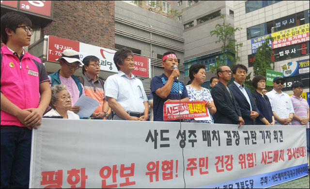 평화통일대구시민연대, 대구경북진보연대 등 26개 단체가 참여하는 '사드배치 반대 대구경북대책위원회'는 14일 오전 새누리당 대구경북 시·도당 앞에서 기자회견을 갖고 "사드 성주배치 철회"와 "국내 도입 무효화"를 촉구했다. 특히 "영남권인 성주가 부지로 선정되면서 국방부가 주장한 수도권 방어목적은 거짓임이 들통났다"며 "사드 도입으로 한국은 얻는 것이 없다"고 강조했다.