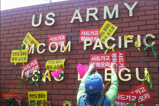 이들은 미사 후 '한반도 평화는 우리 손으로', '사드가고 평화오라' 등이 적인 피켓을 들고 왜관수도원에서 캠프캐럴 정문까지 1.5km가량을 행진했다. 또 미군부대를 향해 종이비행기를 날리고 리본을 달며 "사드배치 결정철회"와 "한반도 평화"를 촉구했다.