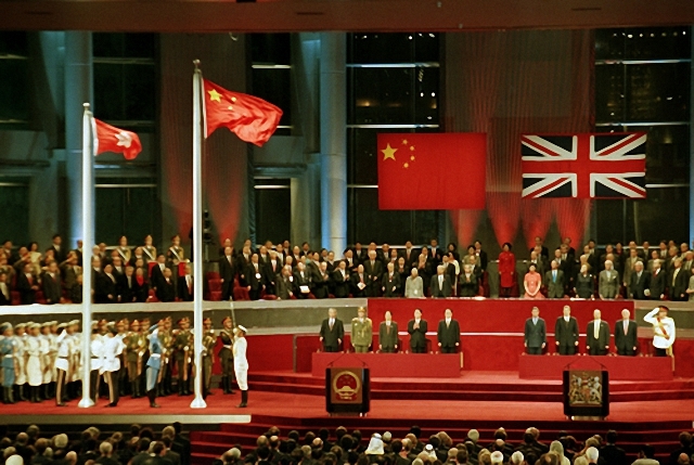 ▲ 지난 1997년 7월 1일 홍콩 컨벤션센터 그랜드 홀에서 열린 주권 반환식 행사에서 중국 국가 '의용군행진곡'이 울려 퍼지는 가운데 중국의 오성홍기(왼쪽 2번째)와 홍콩특별행정구기(왼쪽)가 나란히 게양되고 있다. ⓒ연합뉴스