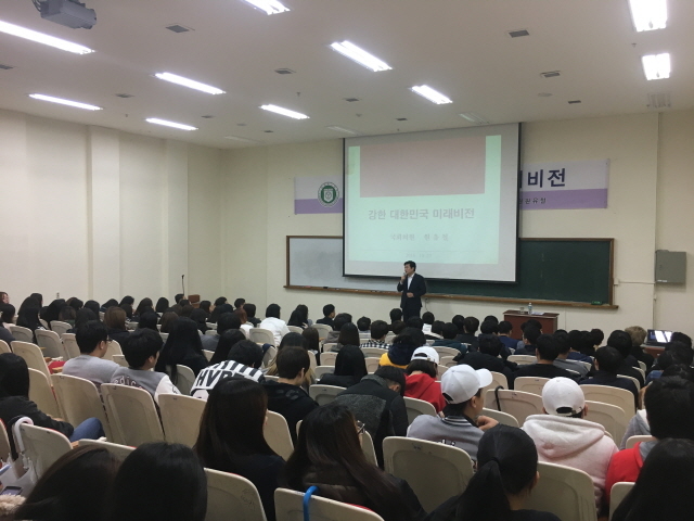 이날 특강에는 교직원과 재학생 200여 명이 참석했다. 원 의원은 경제위기를 극복하기 위해 동북아의 새로운 경제시장을 개척하는 ‘그랜드코리아 실크로드’ 정책을 제안했다.