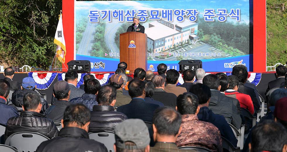 ▲김양호 강원 삼척시장은 2일 삼척시 원덕읍 갈남리 돌기해삼 종묘 배양장 준공식에 참석해 인사말을 하고 있다. 돌기해삼 종묘배양장은 갈남리 옛 신남분교 7107㎡ 부지에 70억 원의 사업비를 투입, 지상 3층 연면적 1056㎡ 규모의 종묘배양시설 및 먹이배양실 등을 갖췄다. 돌기해삼 종묘배양장이 본격 가동되면 고급횟감으로 각광받고 있는 돌기해삼을 연간 500만 마리 규모로 연안어장에 방류, 연 100억 원 이상의 어업소득이 기대된다. ⓒ삼척시