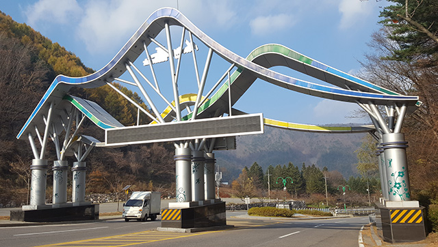 사업비 1억 8348만 원이 투자된 시 관문 경계 상징조형물은 지난 2008년 개장한 오투리조트에 맞춰 고원레저와 스포츠도시 상징을 형상화한 역동적인 의미도 내포하고 있다.
