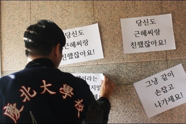 학생들은 A4용지를 벽에 계속 붙였고 교수들과 직원들은 보이는 족족 찢어 쓰레기통에 넣었다. 몸싸움은 그렇게 30분간 지속됐다. 강연장에 이미 와 있던 김 전 대표는 눈을 감고 사태를 방관했다. 곧 한 교수가 "미안하다. 고의가 아니다. 강연은 해야 하니 끝나고 말하자"고 해 실랑이는 일단락됐다.