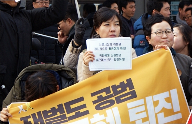 권택흥 민주노총대구지역본부장은 "상인들이 화재로 삶의 터전을 잃었다. 엄청난 아픔에 빠져있다"면서 "자격을 상실한 대통령은 인기몰이를 하러 올 것이 아니라 퇴진해야 한다"고 말했다. 이인순 정신대할머니와 함께하는시민모임 사무처장도 "대구경북에 남아있는 마지막 민심을 끌어모아 정치적으로 이용하려는 것"이라며 "재난으로 고통받고 있는 민심을 이용하는 것을 봤을 때 스스로 퇴진할 생각은 없어 보인다"고 했다.